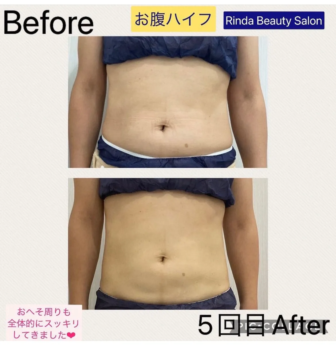 お腹ハイフ 『下っ腹が特に気になる』 という事でお腹ハイフを続けて下さっているお客様 施術5回目のAfterです♪お腹のスッキリ感もご自身で 実感していただいてるようで 減ってきたのが分かると 仰られて…