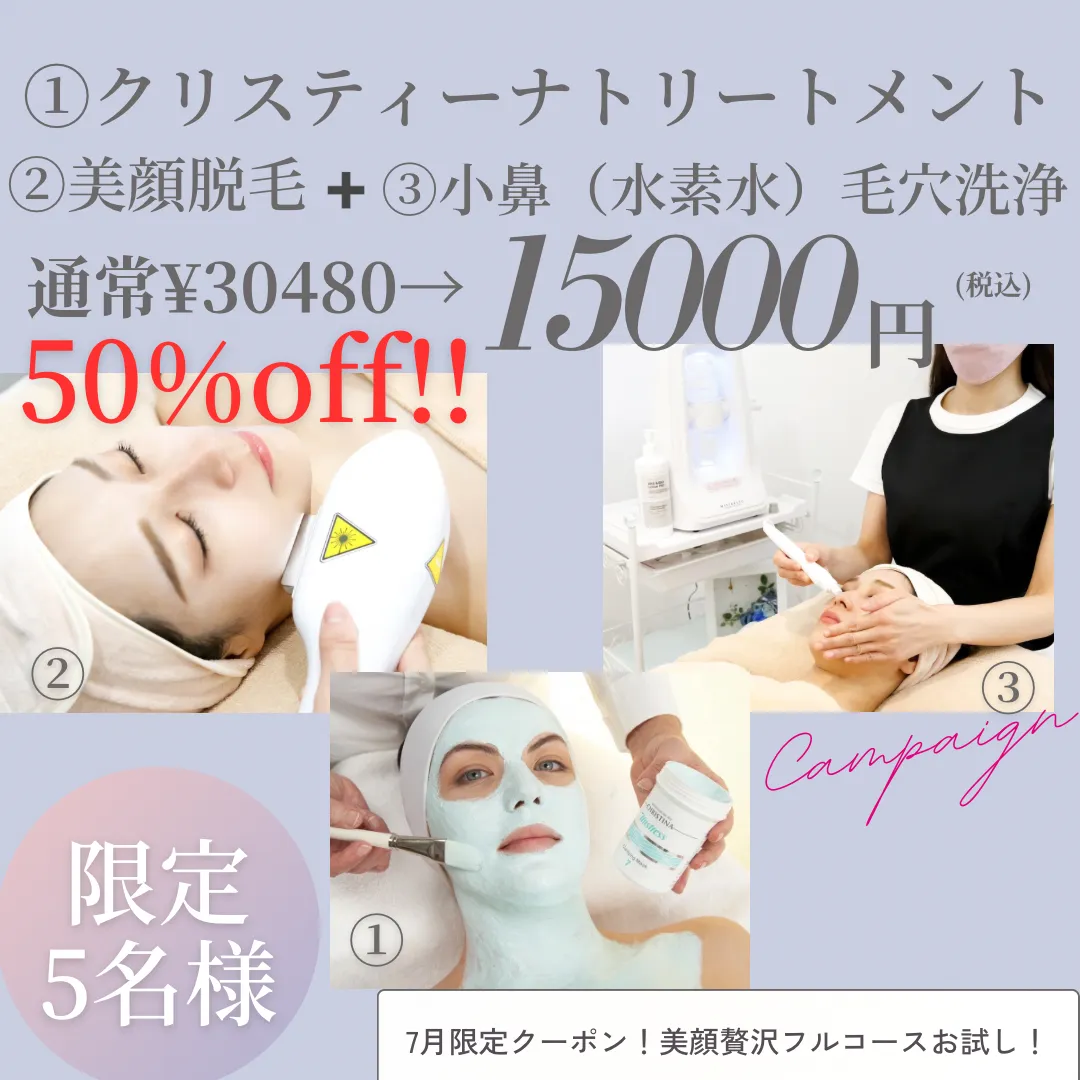 「毛穴の開き」「黒ずみ」「赤み」「乾燥」「ニキビ」…こんなお悩みありませんか? 一度の施術で全て解決したいと思ったこと、ありませんか? そんなお悩みを解決する、人気メニュー3つを組み合わせた最…
